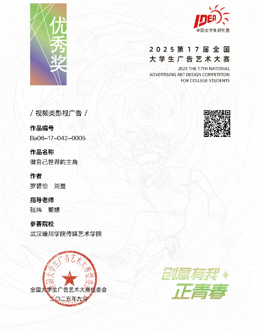 在第十七届大广赛中,郭婧老师指导罗碧怡、刘曼同学完成的视频作品《做自己世界的主角》,以极具共鸣的视角和细腻的影像语言,传递出积极向上的价值观,最终荣获国家级优秀奖。梁骐麒、张欢、张琦等教师亦充分发挥专业所长,在创意策划、视觉表达等方面给予学生细致指导。他们所带领的学生团队凭借独特的创意与扎实的执行,一举斩获省级一等奖、二等奖、三等奖及优秀奖等多个奖项。备赛期间,同学们主动探索社会热点、深入挖掘品牌内涵,在一次次思维碰撞与方案迭代中锤炼创意、打磨作品,最终交出令人瞩目的专业答卷。