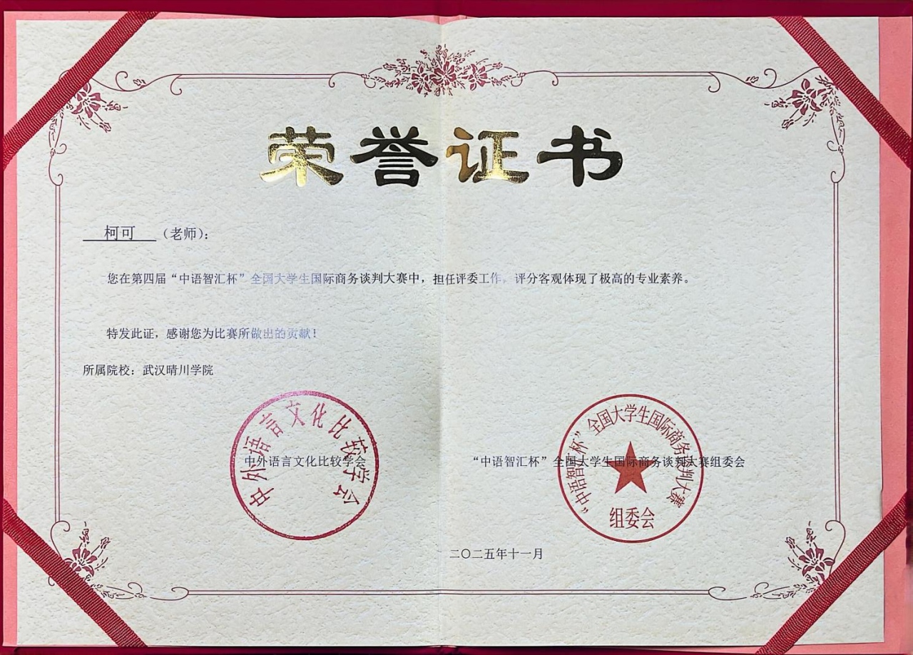(通讯员:柯可 编辑:刘小丹)近日,在第四届“中语智汇杯”全国大学生国际商务谈判大赛全国总决赛中,武汉晴川学院外国语学院与来自全国高校的143支晋级队伍同台竞技,团队(成员:王德琳、周欢、刘畅、陈盈盈)在柯可、舒亚琴两位教师的指导下,凭借扎实的功底、稳定的发挥与出色的团队协作,最终荣获全国三等奖。柯可、舒亚琴老师获评“优秀指导教师”,柯可老师还应邀担任了本届大赛全国总决赛的评委。
